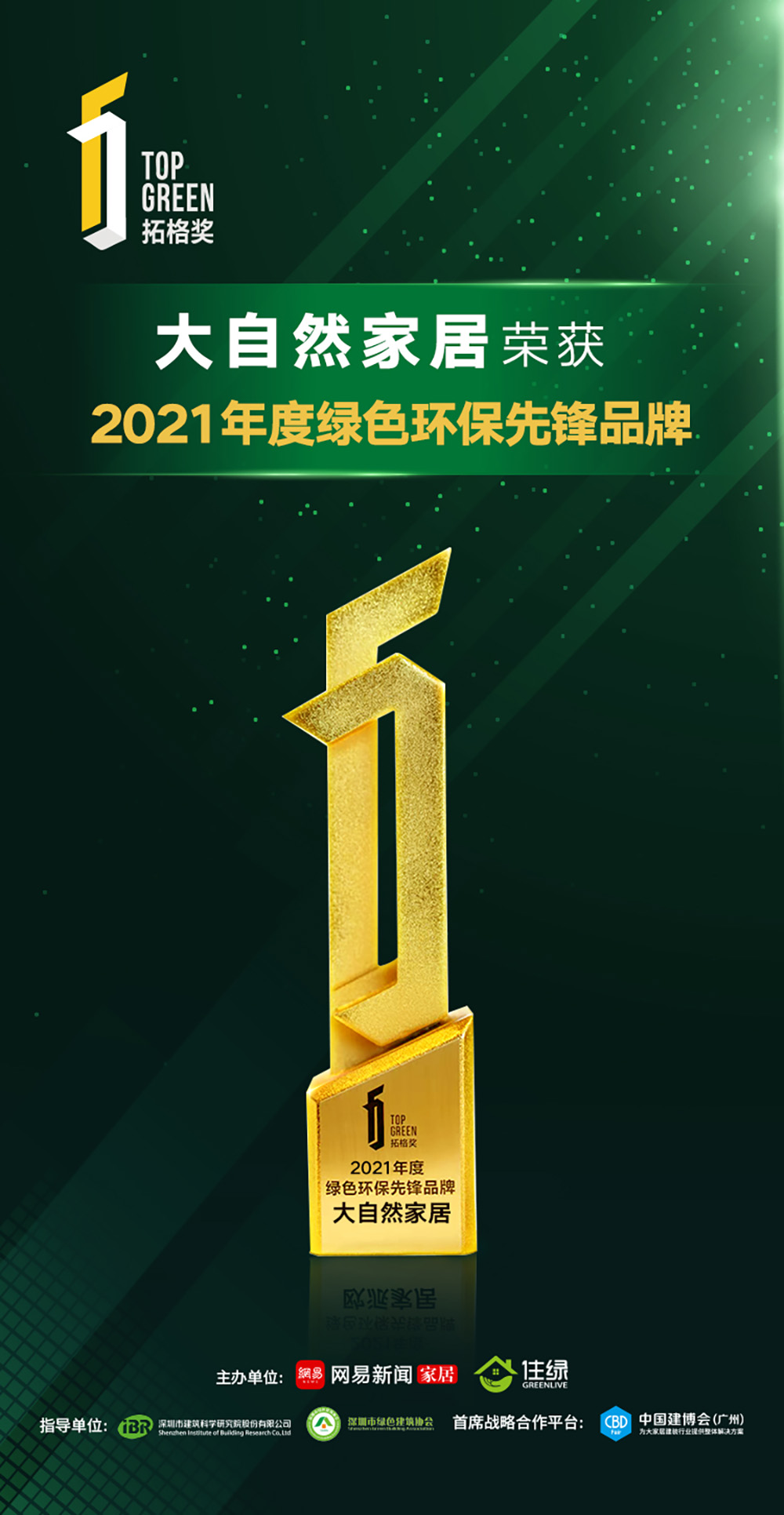 2022年1月15日,“嚴選好家 向好生活提案——2021網易中國家居冠軍榜暨拓格獎頒獎盛典”在線上隆重舉行,家居領袖齊聚云端,共襄行業年度盛宴。大自然家居憑借實力獲得“2021年度中國家居冠軍榜行業領軍品牌”和“2021年度綠色環保先鋒品牌”兩大獎項,大自然實木地板榮獲“2021年度嚴選綠色家居產品”。