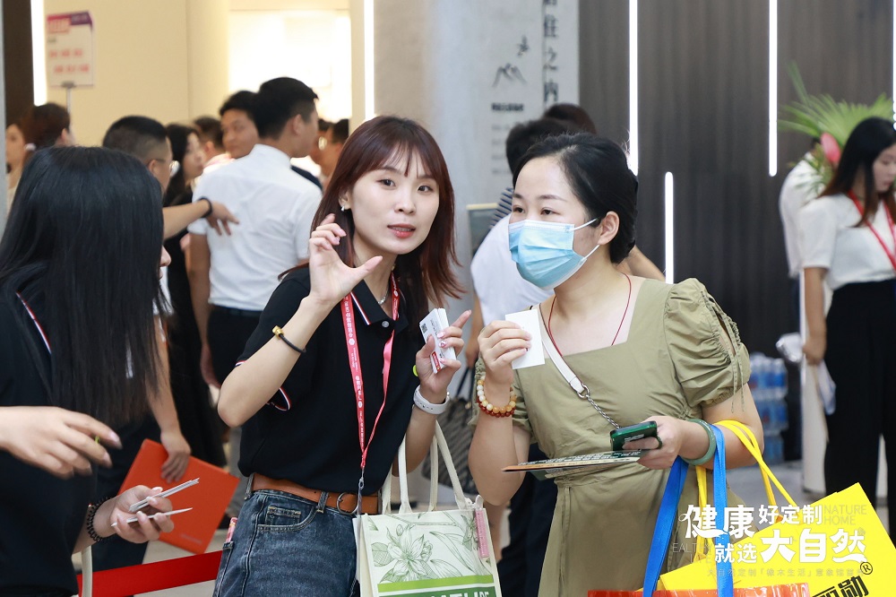 建博會期間,大自然家居攜500+㎡「橡木生活」意象館 | 地門墻柜一體健康整家定制形象亮相,廣受好評。現場人氣超預期火爆,超額實現招商目標。