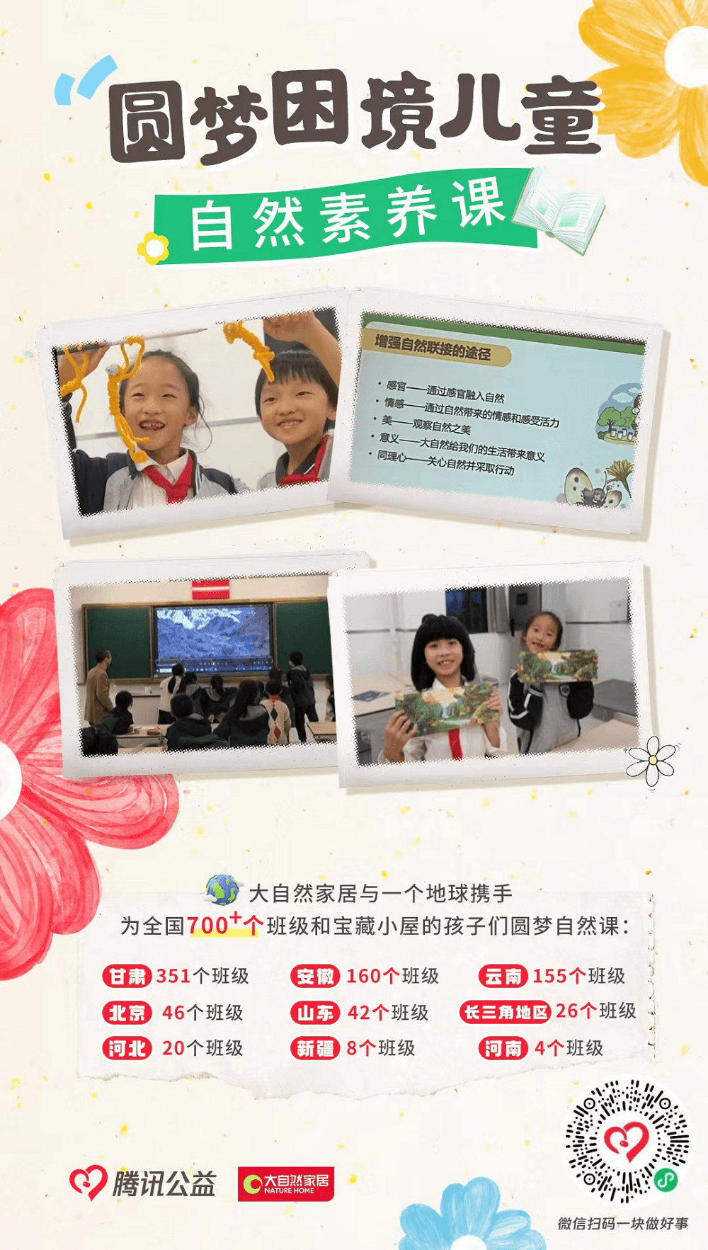 今年99公益日,騰訊公益攜手深圳市“一個地球”自然基金會、上海聯勸公益基金會,將關懷投向城市里的困境兒童,為鄉村學校提供豐富的生物多樣性保護課程,提升當地青少年的環保意識,在促進教育公平和普惠的同時,培養熱愛自然、尊重自然的鄉村生態文明新一代。公益行動期間,只要捐贈32元即可支持一名困境兒童一堂自然課,本次公益行動預計覆蓋甘肅351個班級、安徽160個班級、云南155個班級、北京46個班級、山東42個班級、長三角地區26個班級、河北20個班級、新疆8個班級、河南4個班級,為全國超700個班級和寶藏小屋的孩子們圓夢自然課助力。
